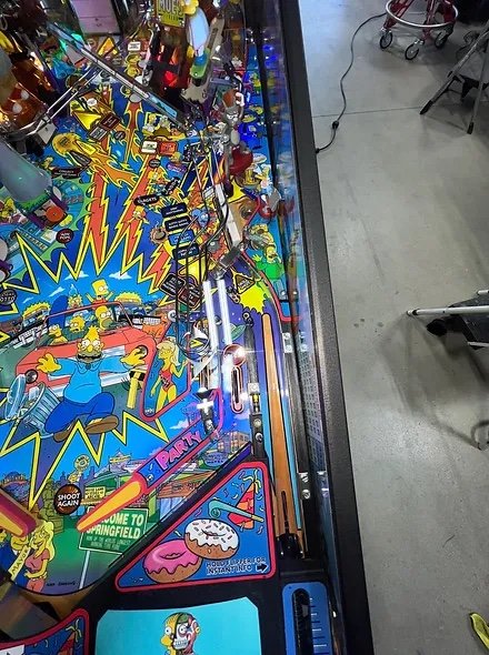 Playfield Toys: Homer’s head moves on playfield, with lamp inside. Itchy & Scratchy figures. Comic Book Guy figure. Bart figure. Television — a 3-color digital LED dot matrix display. Living room “couch” (3 ball lock) on upper playfield.