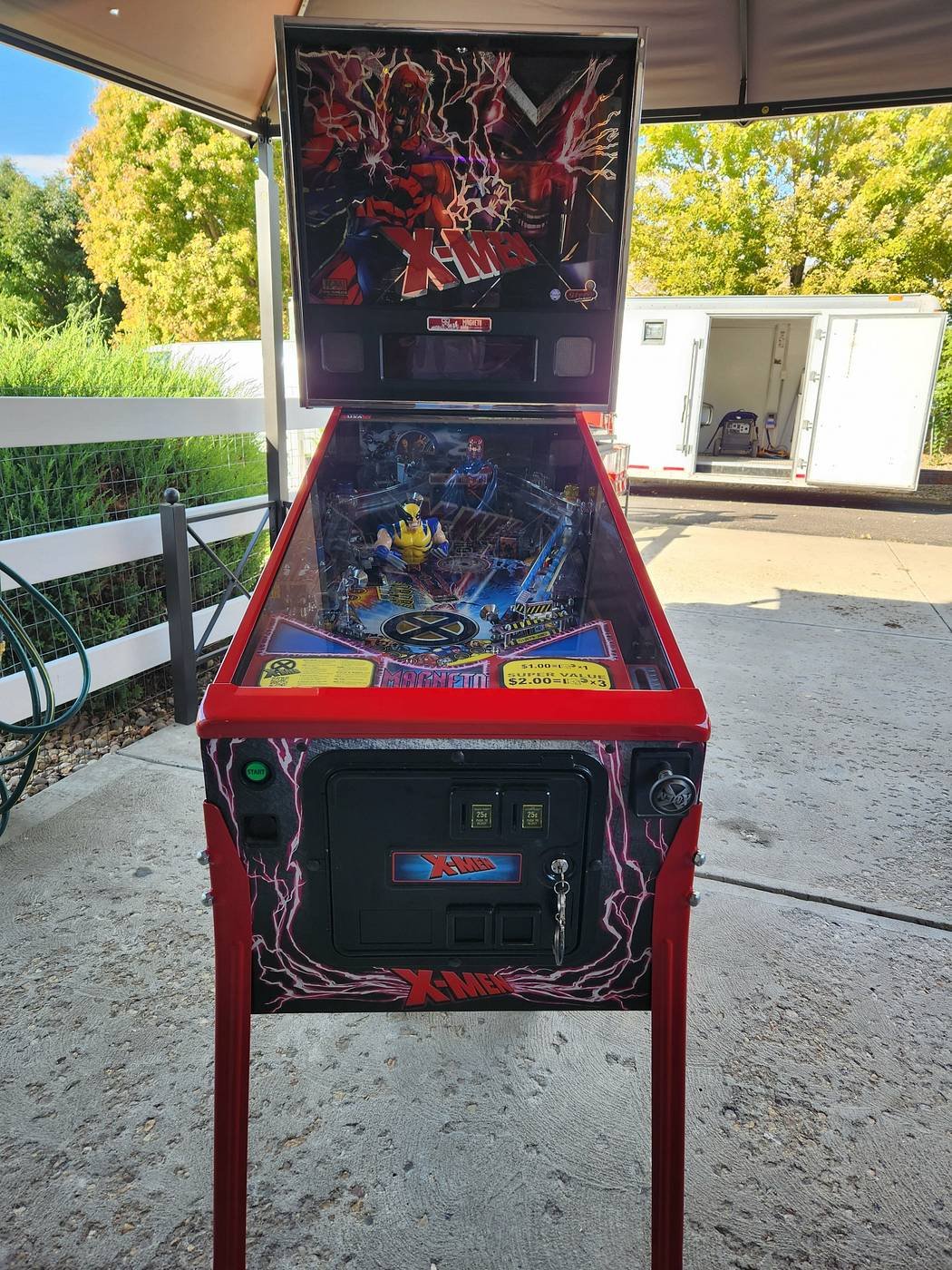 Flippers (3), Pop bumpers (3), Slingshots (2), Magnets (2), Standup targets (7), Spinning target (1), Vertical Up-kicker (1), Scoop (1), Dual Up-post captive ball lock (1), Dual right inlanes, Multiball, Speech. Backbox fluorescent lighting. Toys include a Magneto molded upper body figurine and Wolverine molded upper body figurine.
